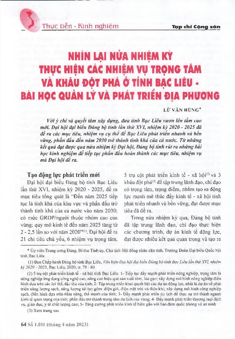Nhìn lại nửa nhiệm kỳ thực hiện các nhiệm vụ trọng tâm và khâu đột phá ở tỉnh Bạc Liêu - Bài học quản lý và phát triển địa phương