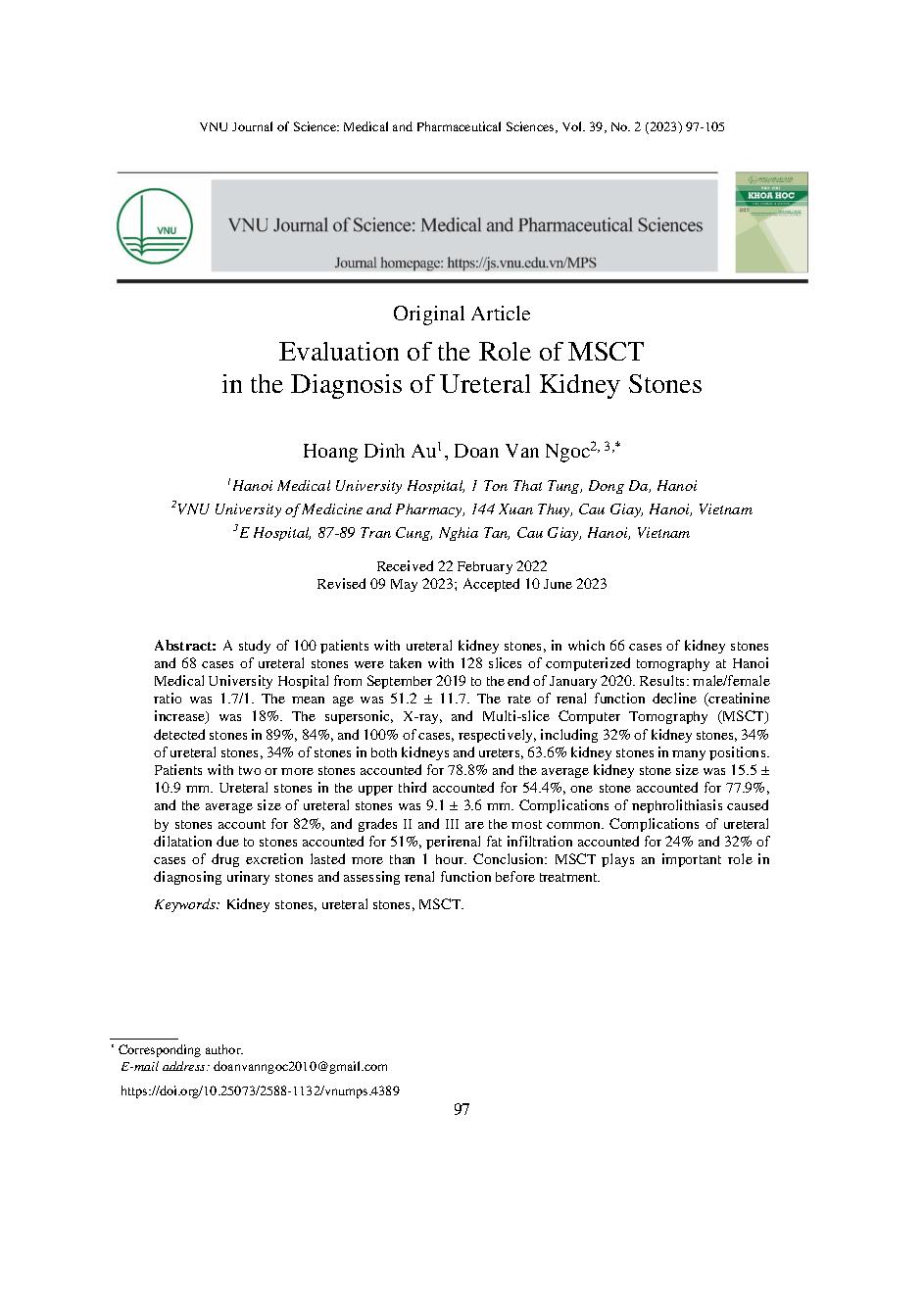 Đánh giá vai trò của cắt lớp vi tính đa dãy trong chẩn đoán sỏi thận niệu quản = Evaluation of the Role of MSCT in the Diagnosis of Ureteral Kidney Stones