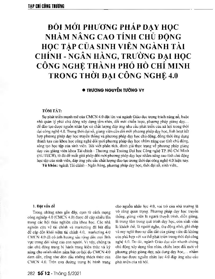 Đổi mới phương pháp dạy học nhằm nâng cao tính chủ động học tập của sinh viên ngành Tài chính - Ngân hàng, Trường Đại học công nghệ Thành phố Hồ Chí Minh trong thời đại công nghệ 4.0 = Innovating teaching methods to make students of Ho Chi Minh City University of Technology more active in learning in the context of Industry 4.0