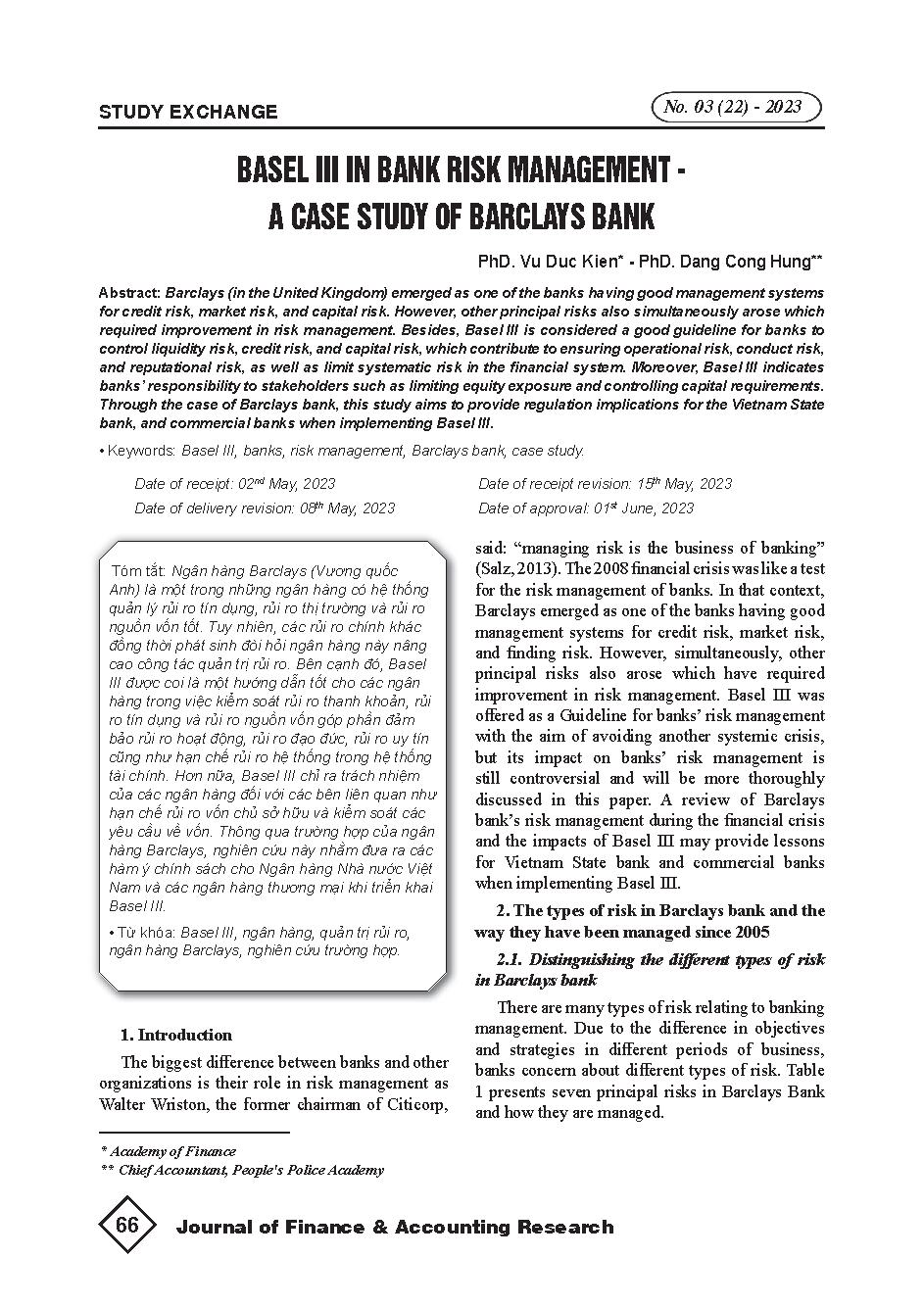 Basel III trong quản lý rủi ro ngân hàng - một tình huống nghiên cứu Ngân hàng Barclays = Basel III in bank risk management - A case study of Barclays bank