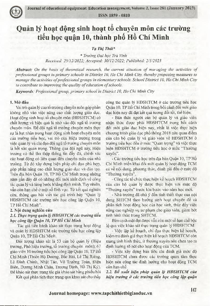 Quản lý hoạt động sinh hoạt tổ chuyên môn các trường tiểu học quận 10, thành phố Hồ Chí Minh = Managing the activities of professional groups at primary schools in District 10, Ho Chi Minh City