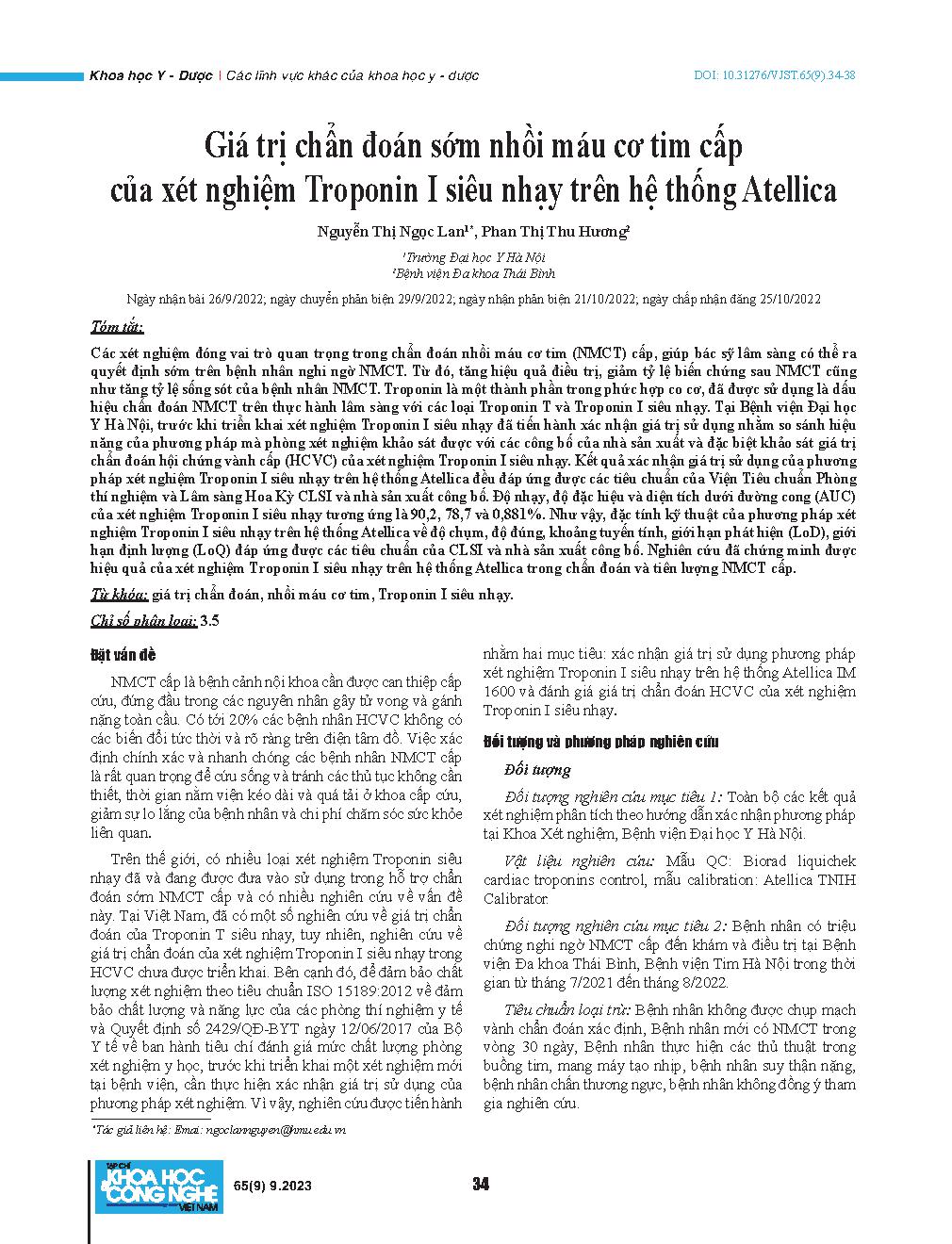 Giá trị chẩn đoán sớm nhồi máu cơ tim cấp của xét nghiệm Troponin I siêu nhạy trên hệ thống Atellica = The value of early diagnosis of acute myocardial infarction of the high-sensitivity Troponin I assay on the Atellica analyzer