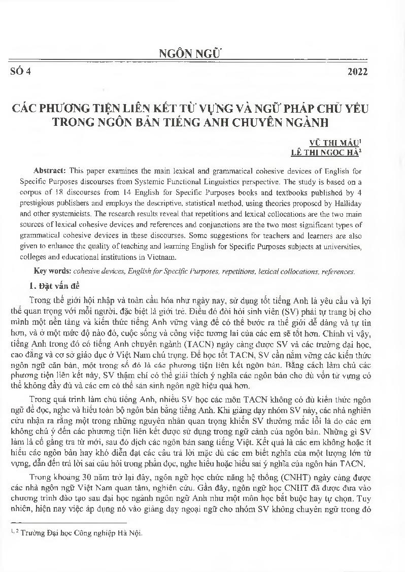 Các phương tiện liên kết từ vựng và ngữ pháp chủ yếu trong ngôn bản tiếng Anh chuyên ngành = Main lexical and grammatical cohesive devices in English for specific purposes discourses