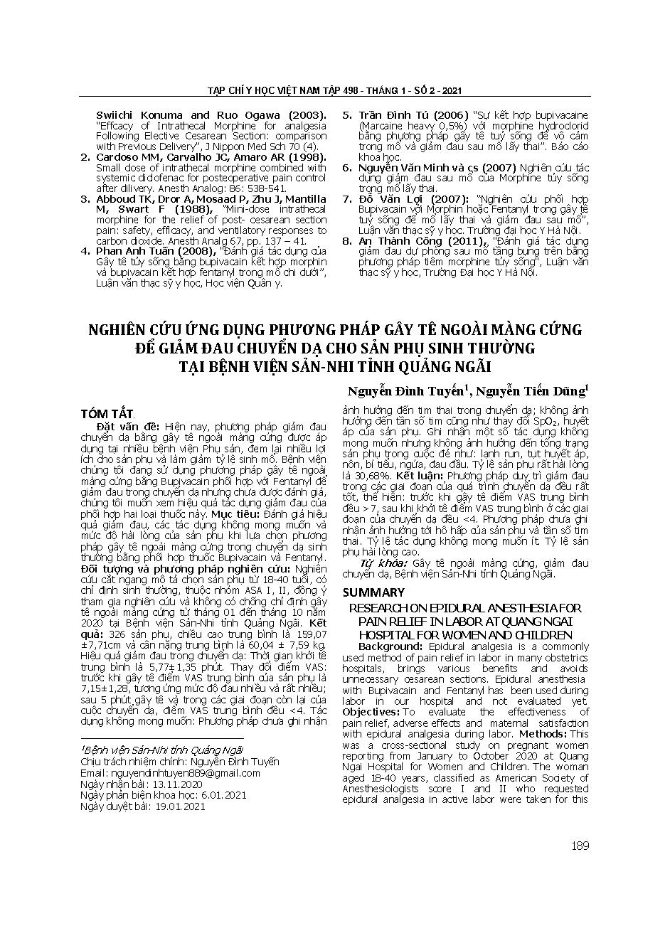 Nghiên cứu ứng dụng phương pháp gây tê ngoài màng cứng để giảm đau chuyển dạ cho sản phụ sinh thường tại Bệnh viện Sản-Nhi tỉnh Quảng Ngãi = Research on epidural anesthesia for pain relief in labor at quang ngai hospital for women and children