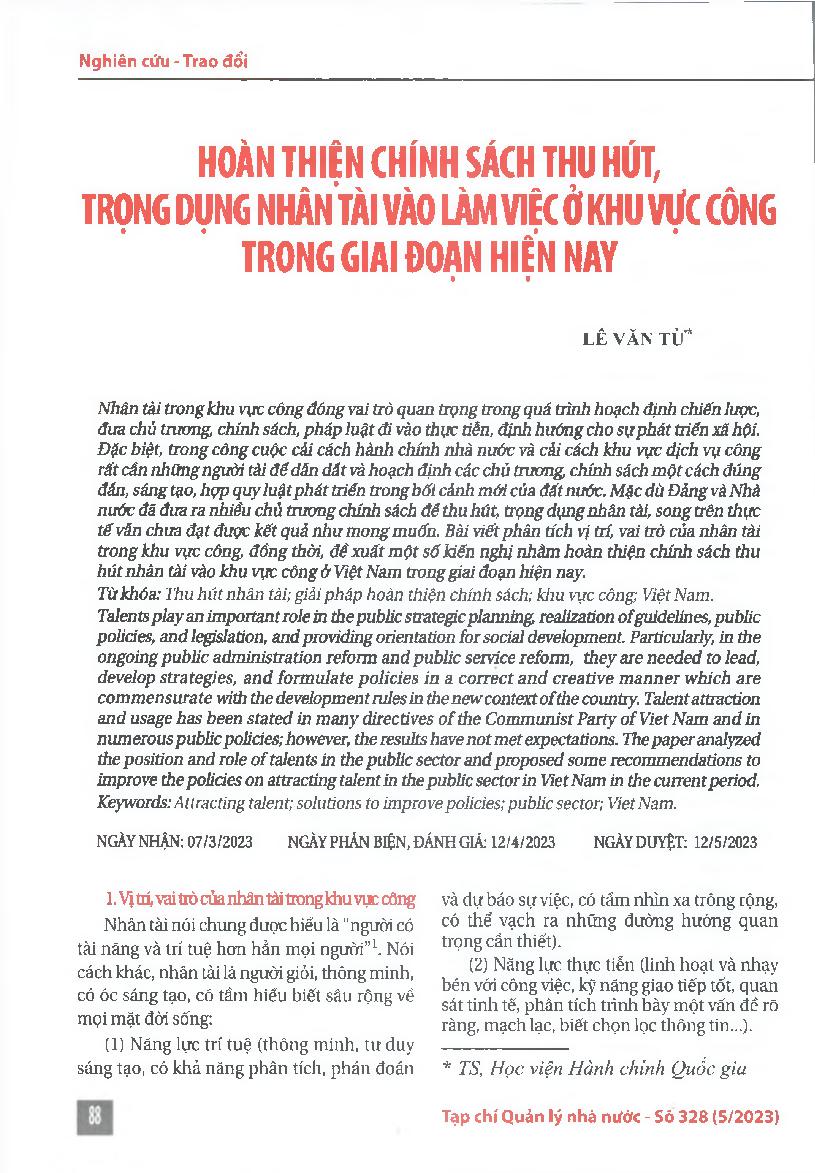Hoàn thiện chính sách thu hút, trọng dụng nhân tài vào làm việc ở khu vực công trong giai đoạn hiện nay = Completion of the policies on attracting and utilizing talents to work in the public sector in the present period