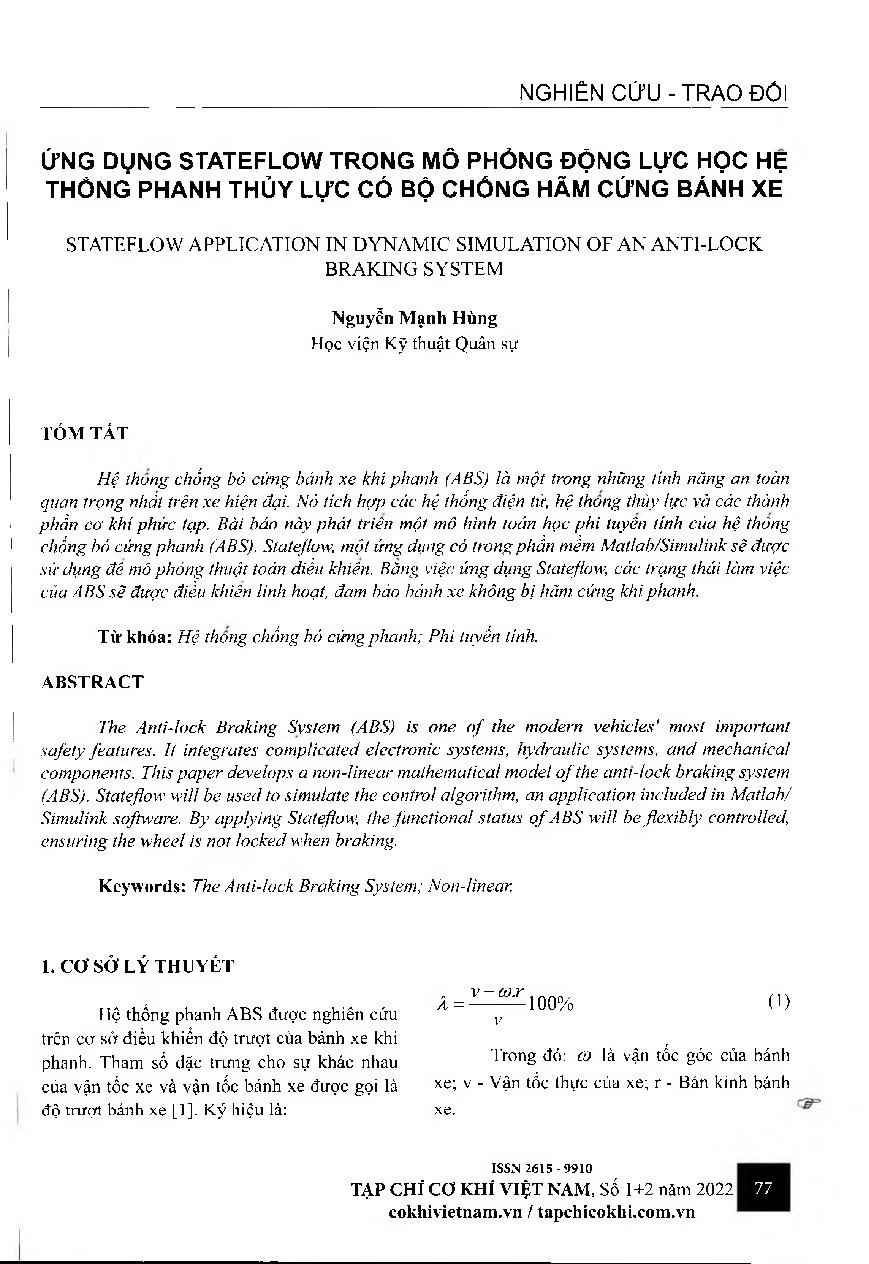 Ứng dụng Stateflow trong mô phỏng động lực học hệ thống phanh thủy lực có bộ chống hãm cứng bánh xe. = Stateflow application in dynamic simulation of an anti-lock braking system