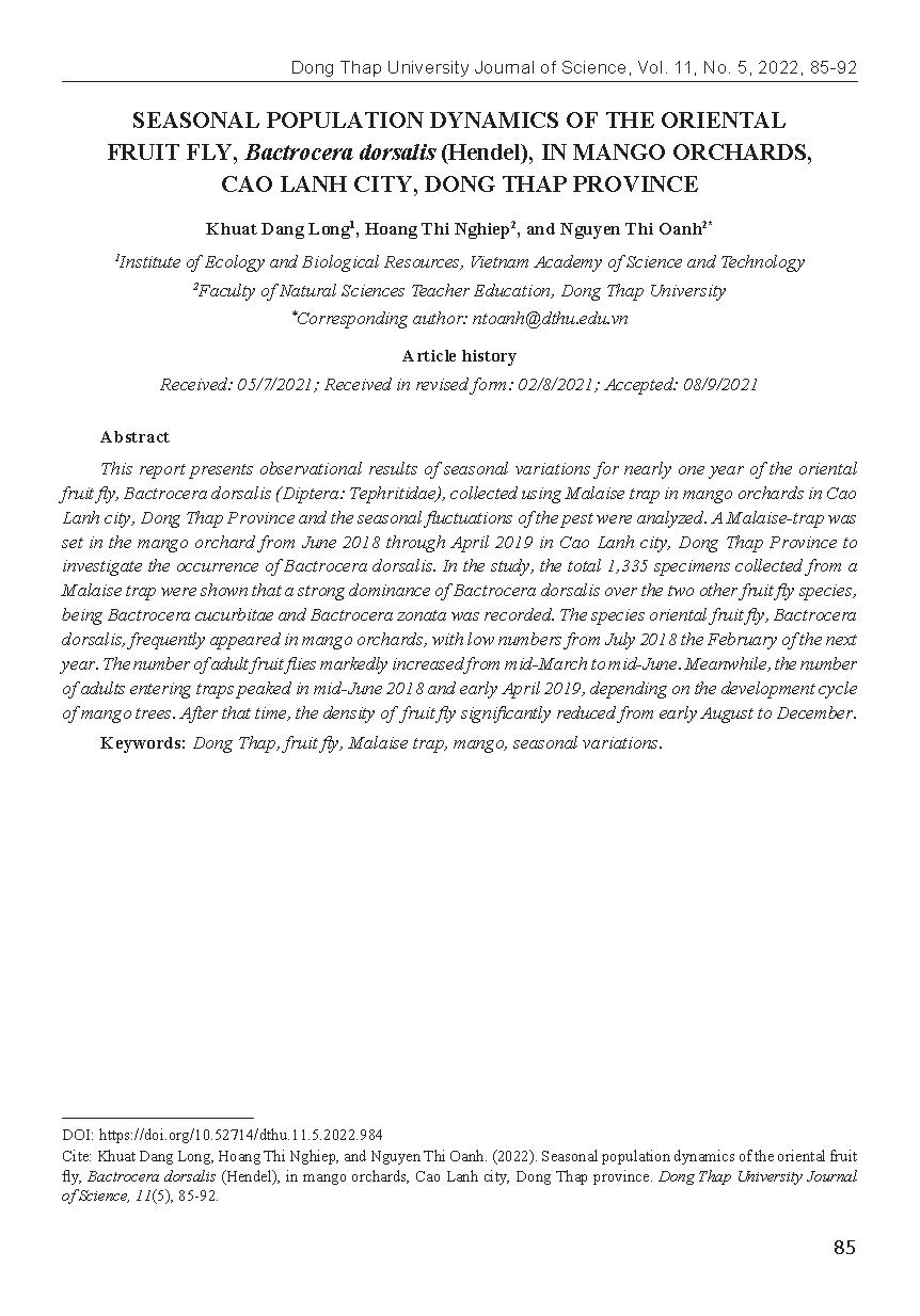 Biến động theo mùa của ruồi đục quả phương đông, Bactrocera dorsalis (Hendel), trong vườn xoài ở thành phố Cao Lãnh, tỉnh Đồng Tháp = Seasonal population dynamics of the oriental fruit fly, Bactrocera dorsalis (Hendel), in mango orchards, Cao Lanh city, D