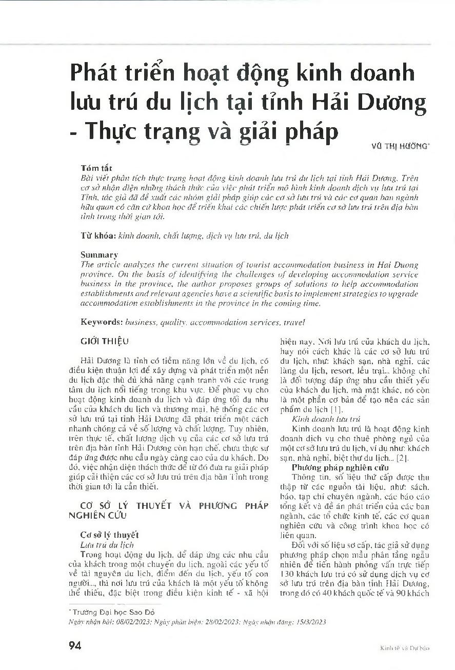 Phát triển hoạt động kinh doanh lưu trú du lịch tại tỉnh Hải Dương - Thực trạng và giải pháp