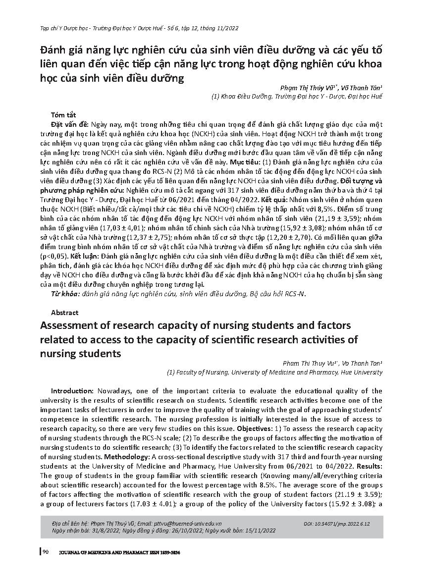 Đánh giá năng lực nghiên cứu của sinh viên điều dưỡng và các yếu tố liên quan đến việc tiếp cận năng lực trong hoạt động nghiên cứu khoa học của sinh viên điều dưỡng = Assessment of research capacity of nursing students and factors related to access to th