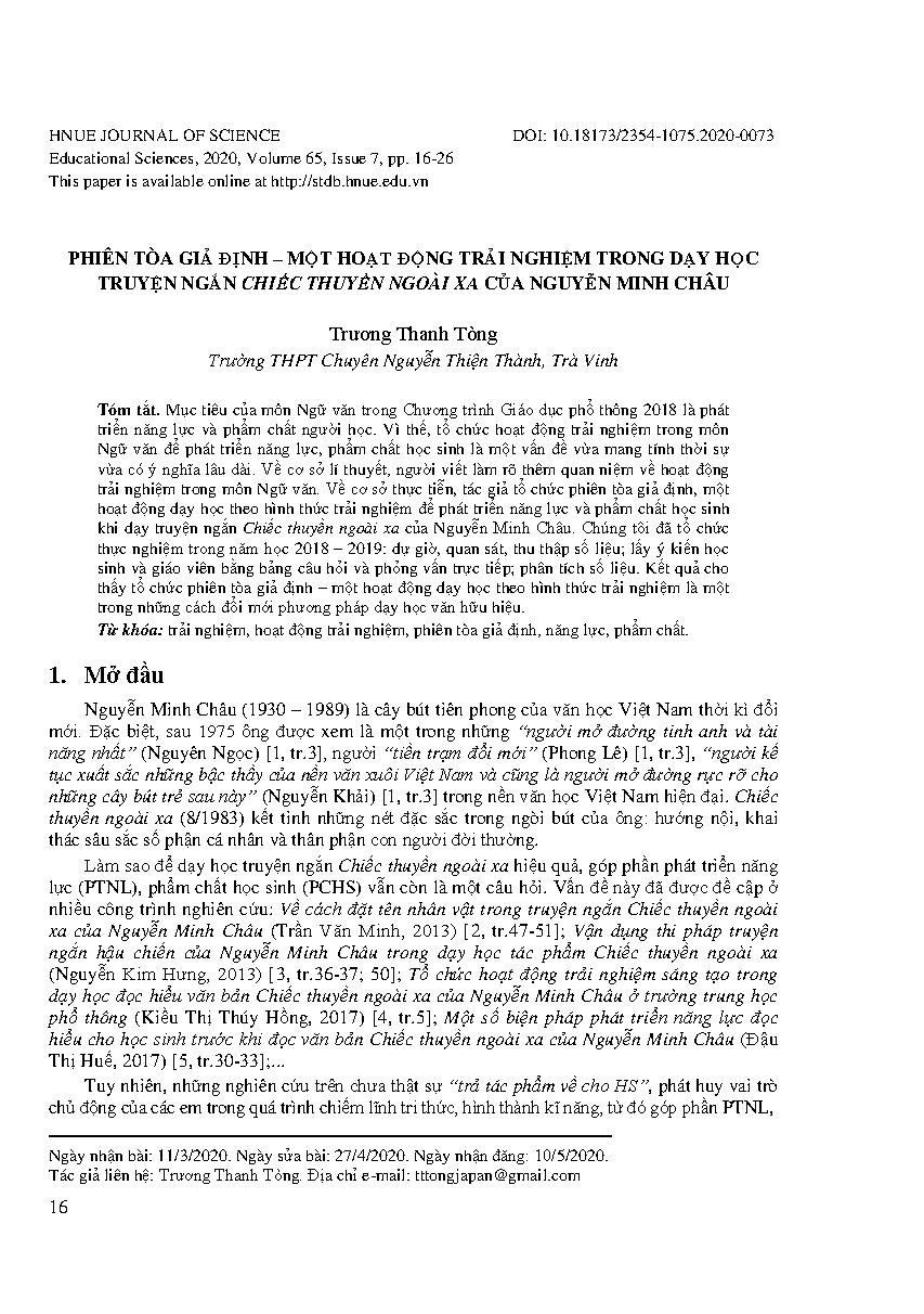 Phiên tòa giả định – Một hoạt động trải nghiệm trong dạy học truyện ngắn Chiếc thuyền ngoài xa của Nguyễn Minh Châu = Mooting court – an experiential activity in teaching short story The boat far out by Nguyen Minh Chau