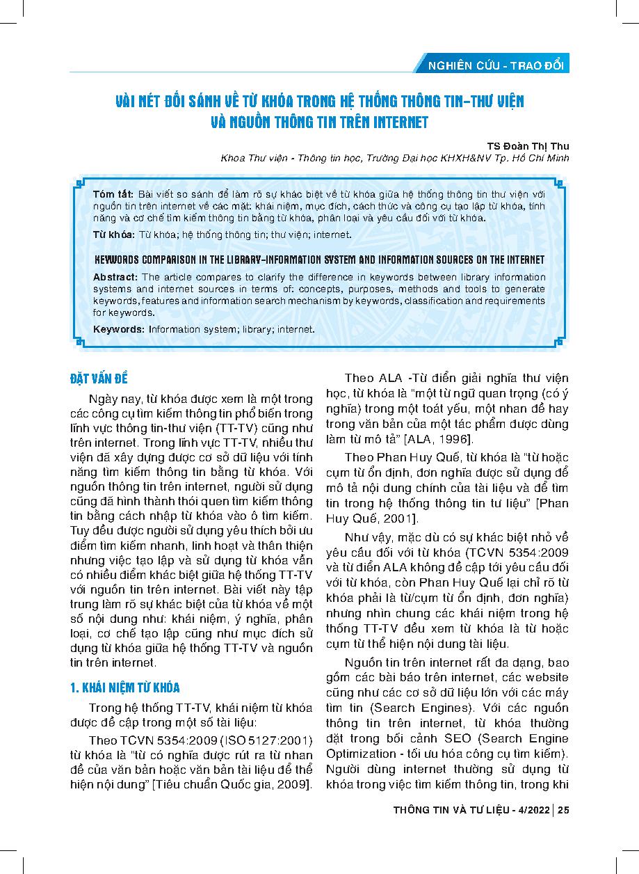 Vài nét đối sánh về từ khóa trong hệ thống thông tin-thư viện và nguồn thông tin trên internet = Keywords comparison in the library-information system and information sources on the internet