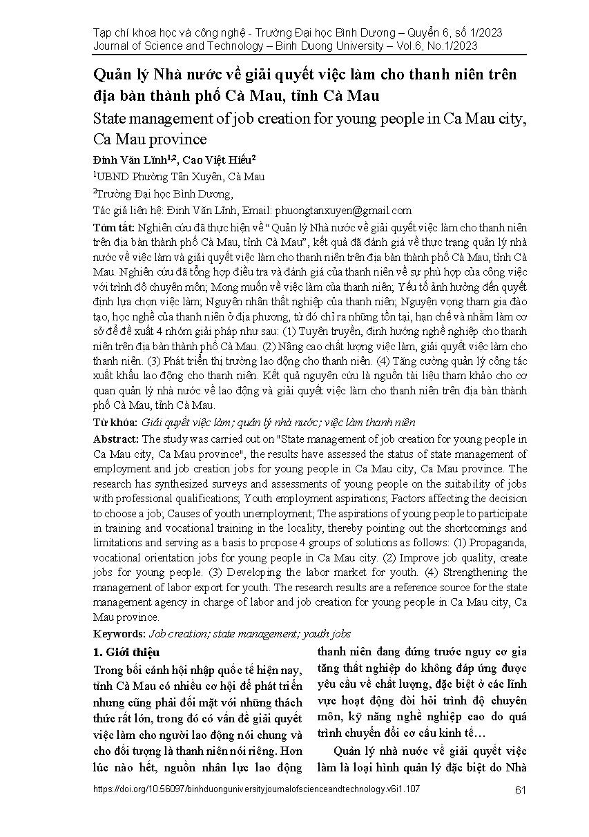 Quản lý nhà nước về giải quyết việc làm cho thanh niên trên địa bàn thành phố Cà Mau, tỉnh Cà Mau = State management of job creation for young people in Ca Mau city, Ca Mau province