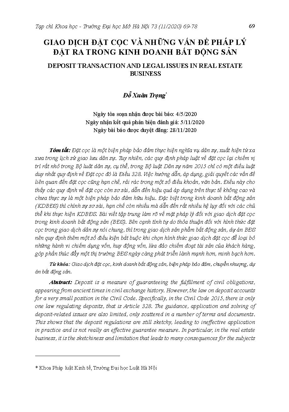 Giao dịch đặt cọc và những vấn đề pháp lý đặt ra trong kinh doanh bất động sản = Deposit transaction and legal issues in real estate business