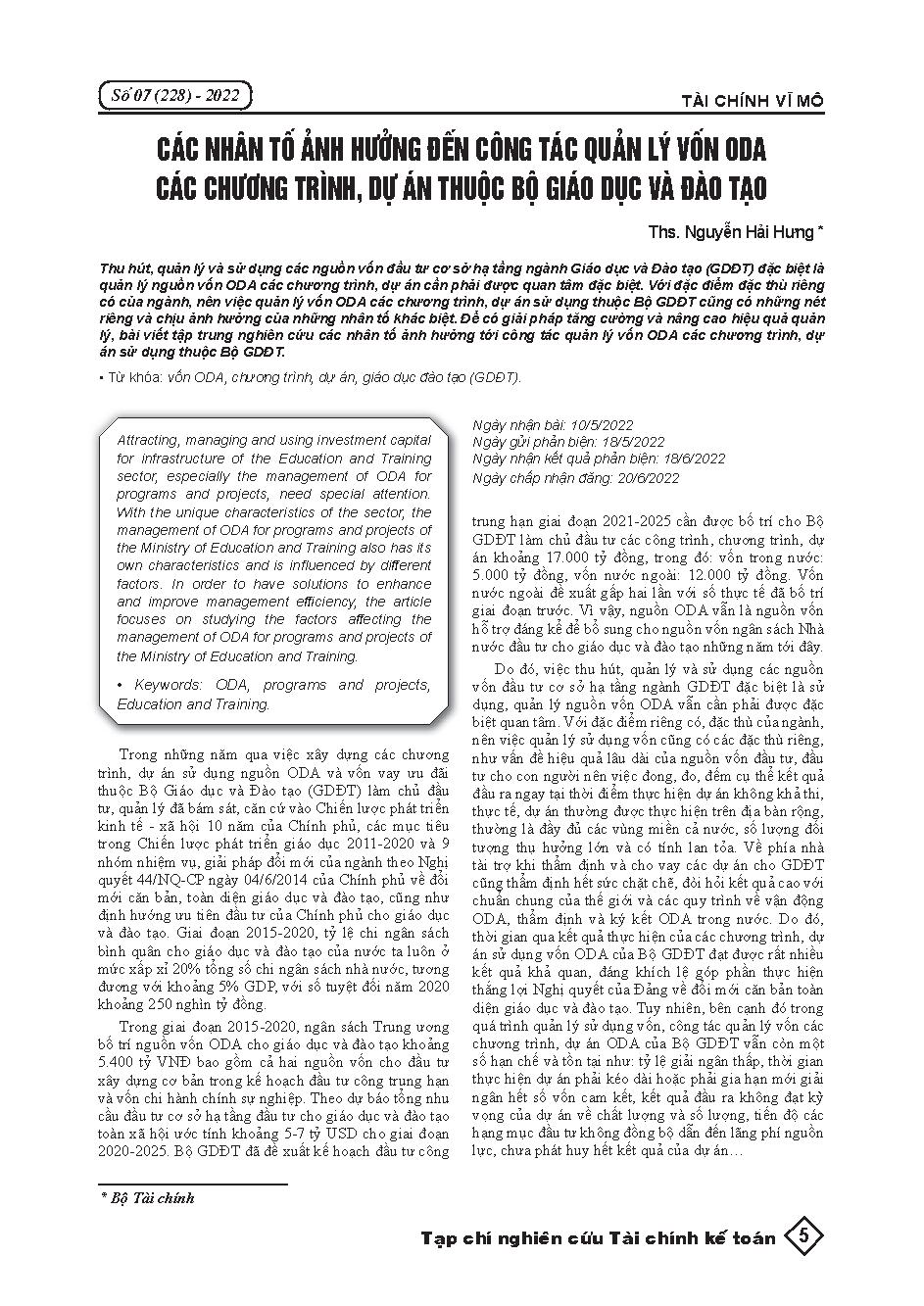 Các nhân tố ảnh hưởng đến công tác quản lý vốn ODA các chương trình, dự án thuộc Bộ Giáo dục và Đào tạo = Factors affecting the management of ODA programs and projects under the Ministry of Education and Training