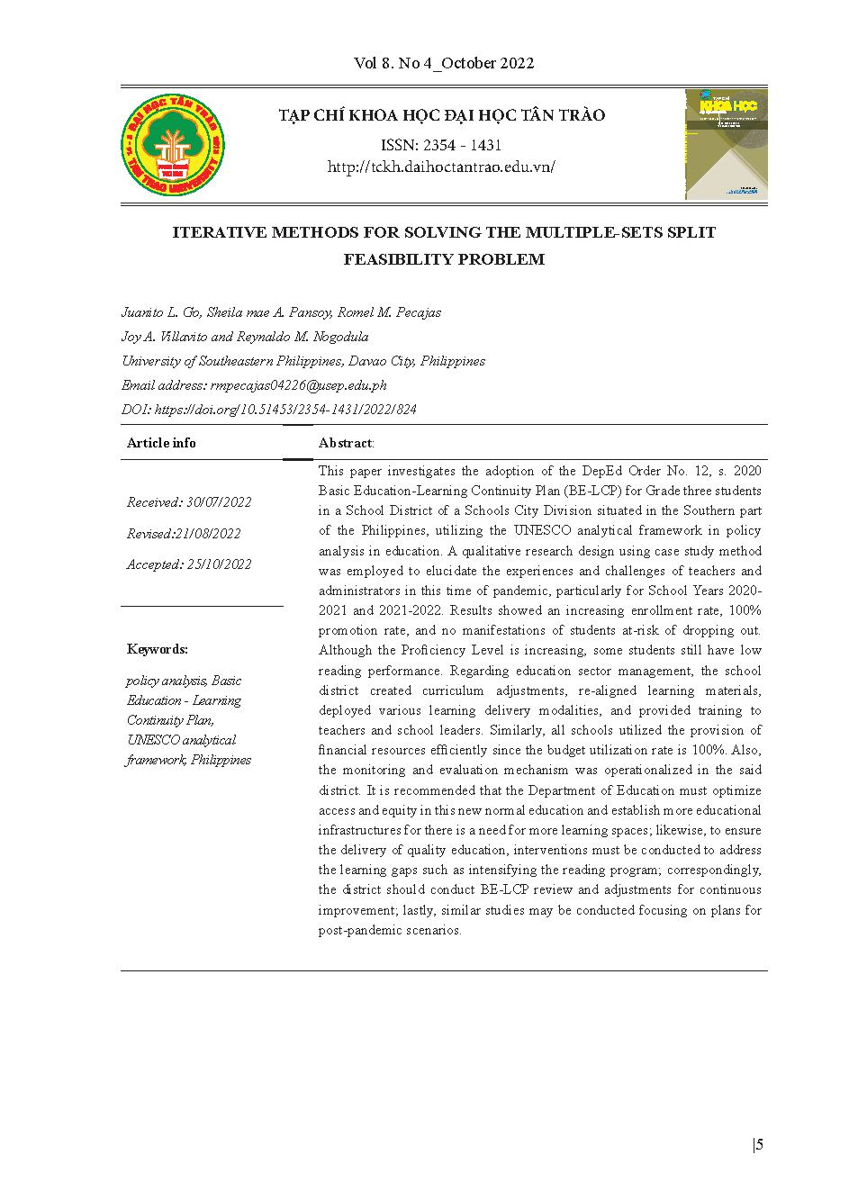 Kế hoạch học tập liên tục tại Philippines: Phân tích chính sách trong bối cảnh đại dịch = Iterative methods for solving the multiple-sets split feasibility problem