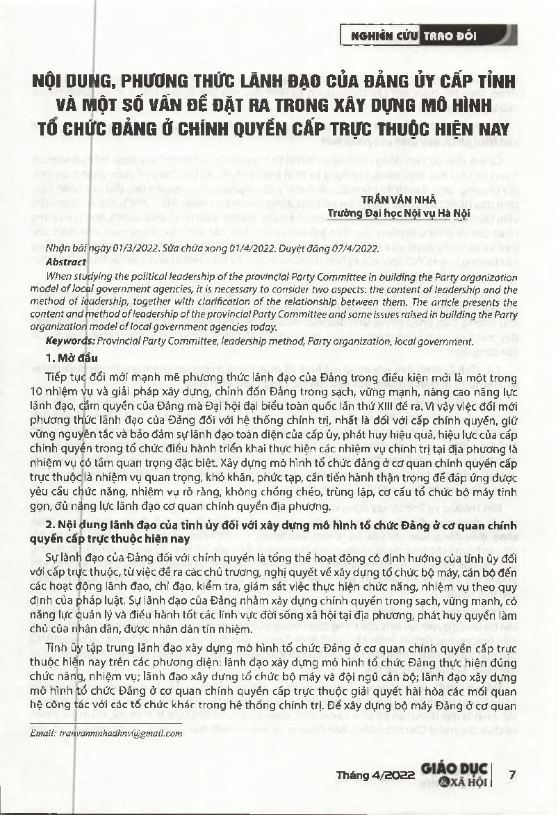 Nội dung, phương thức lãnh đạo của đảng ủy cấp tỉnh và một số vấn đề đặt ra trong xây dựng mô hình tổ chức Đảng ở chính quyền cấp trực thuộc hiện nay = Content and method of leadership of the provincial Party Committee and some issues raised in building P