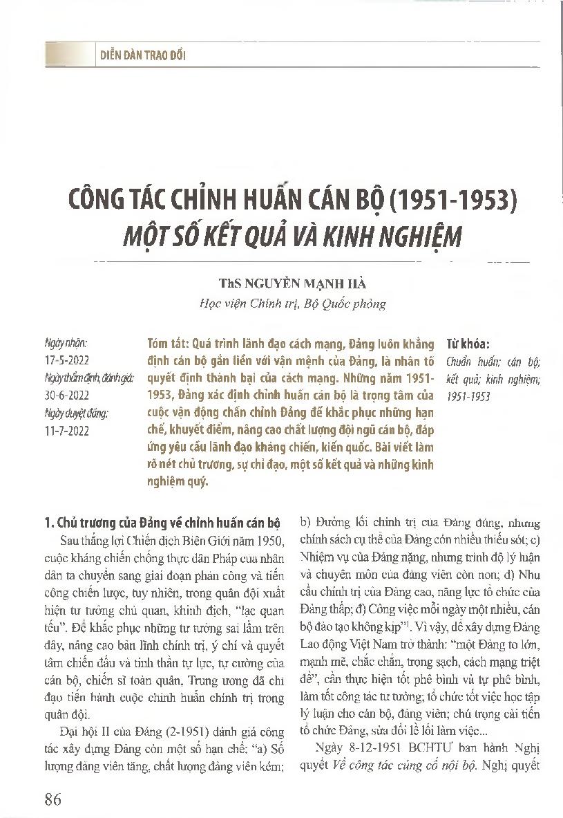Công tác chỉnh huấn cán bộ (1951-1953) một số kết quả và kinh nghiệm = The rectification of cadres (1951-1953) - Results and experiences