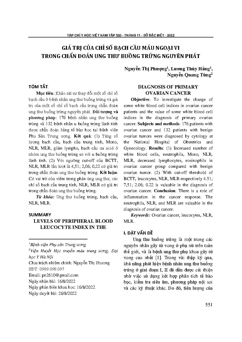 Giá trị của chỉ số bạch cầu máu ngoại vi trong chẩn đoán ung thư buồng trứng nguyên phát = Levels of peripheral blood leucocyte index in the diagnosis of primary ovarian cancer
