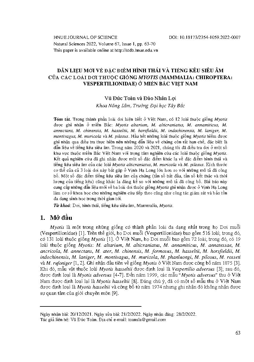 Dẫn liệu mới về đặc điểm hình thái và tiếng kêu siêu âm của các loài dơi thuộc giống myotis (Mammalia: Chiroptera: Vespertilionidae) ở miền Bắc Việt Nam = New morphological and acoustic records of Myotis species (Mammalia: Chiroptera: Vespertilionidae) fr