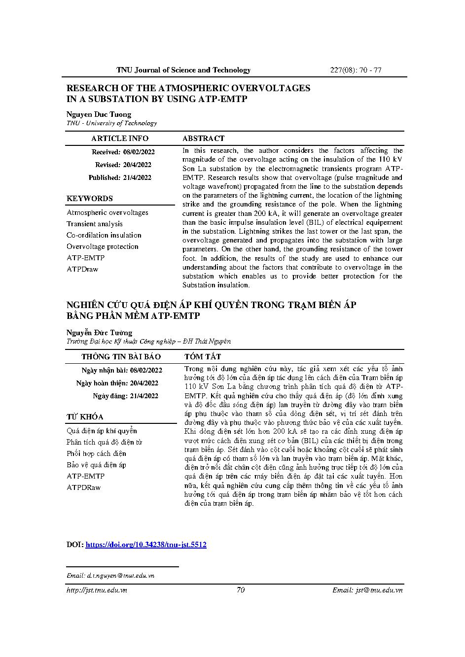 Nghiên cứu quá điện áp khí quyển trong trạm biến áp bằng phần mềm atp-emtp = Research of the atmospheric overvoltages in a substation by using atp-emtp