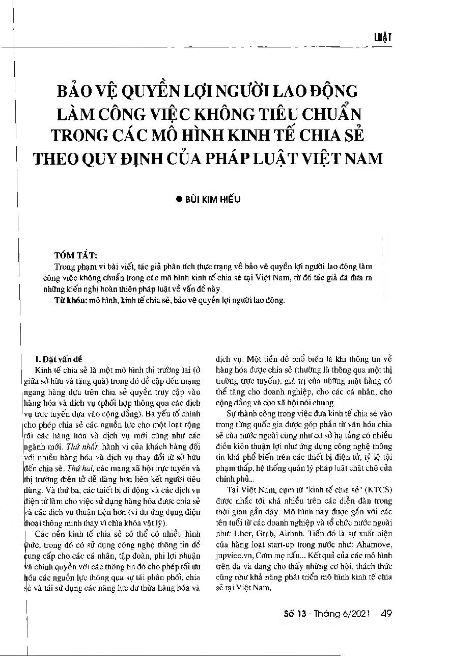 Bảo vệ quyền lợi người lao động làm công việc không tiêu chuẩn trong các mô hình kinh tế chia sẻ theo quy định của pháp luật Việt Nam = Protecting the rights of non-standard workers in sharing economy business models in Vietnam in accordance with Vietnam's laws