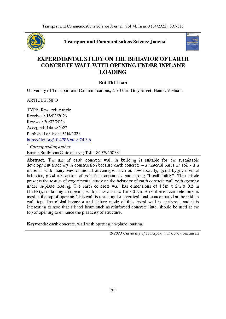 Nghiên cứu thực nghiệm ứng xử của kết cấu tường bê tông đất có khoét lỗ dưới tác dụng của tải trọng trong mặt phẳng = Experimental study on the behavior of earth concrete wall with opening under inplane loading