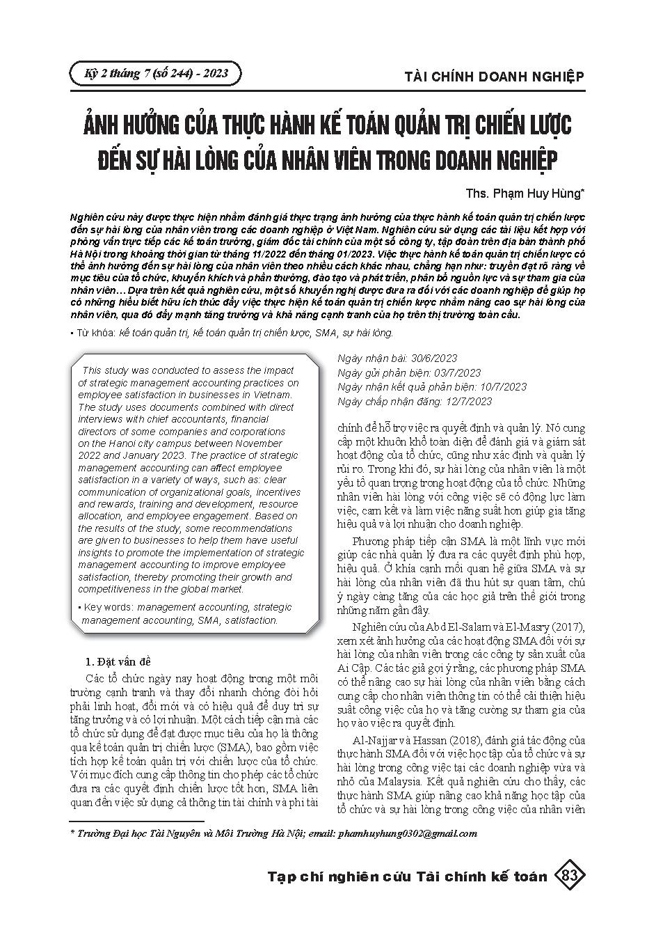 Ảnh hưởng của thực hành kế toán quản trị chiến lược đến sự hài lòng của nhân viên trong doanh nghiệp = The impact of strategic management accounting practices on employee satisfaction in enterprises
