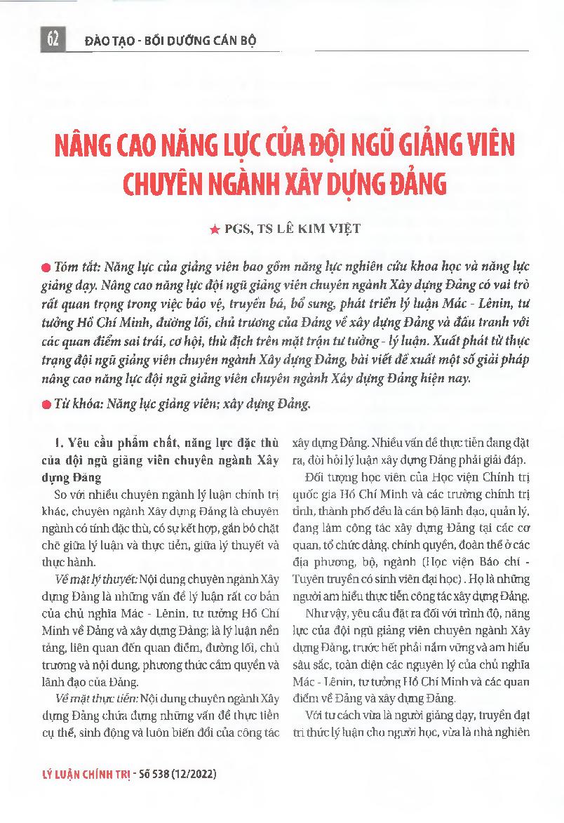 Nâng cao năng lực của đội ngũ giảng viên chuyên ngành xây dựng Đảng = Improve the competency of the lecturers specialized in Party building