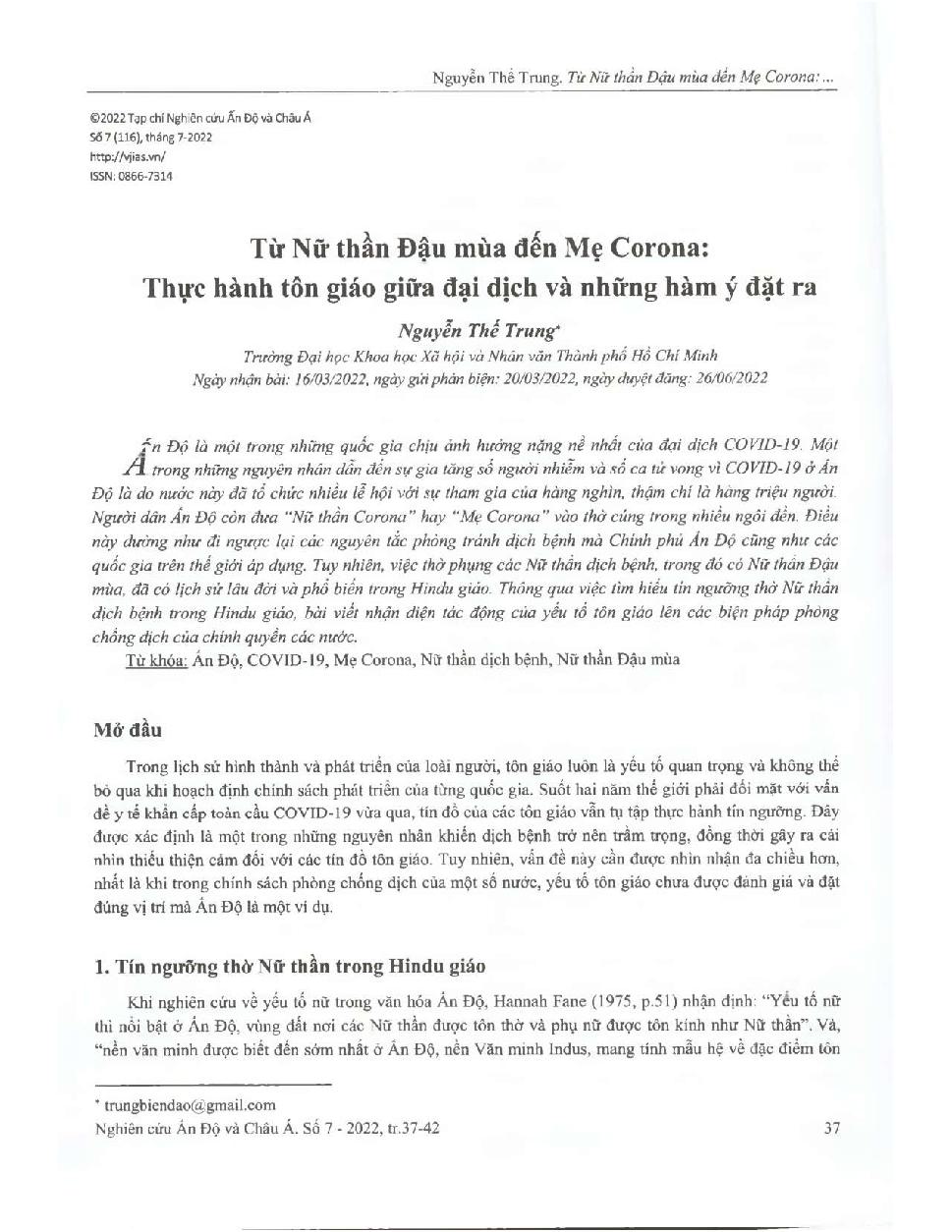 Từ Nữ thần Đậu mùa đến Mẹ Corona: Thực hành tôn giáo giữa đại dịch và những hàm ý đặt ra = From the Smallpox Goddess to Corona Mata: Religious Practice in the Covid-19 pandemic and its implication for the government’s pandemic prevention policy