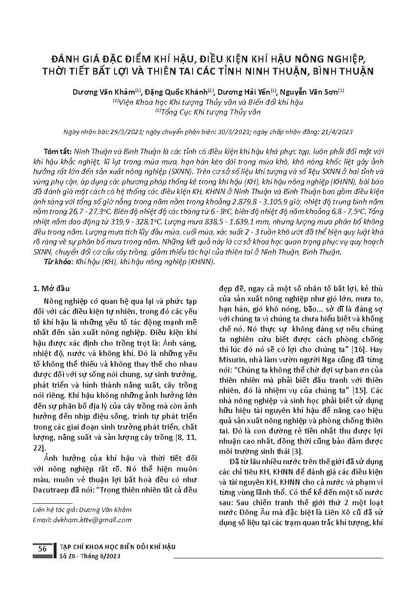 Đánh giá đặc điểm khí hậu, điều kiện khí hậu nông nghiệp, thời tiết bất lợi và thiên tai các tỉnh Ninh Thuận, Bình Thuận = Evaluation of climate characteristics, agro-climatic conditions, adverse weather and natural disasters in Ninh Thuan and Binh Thuan