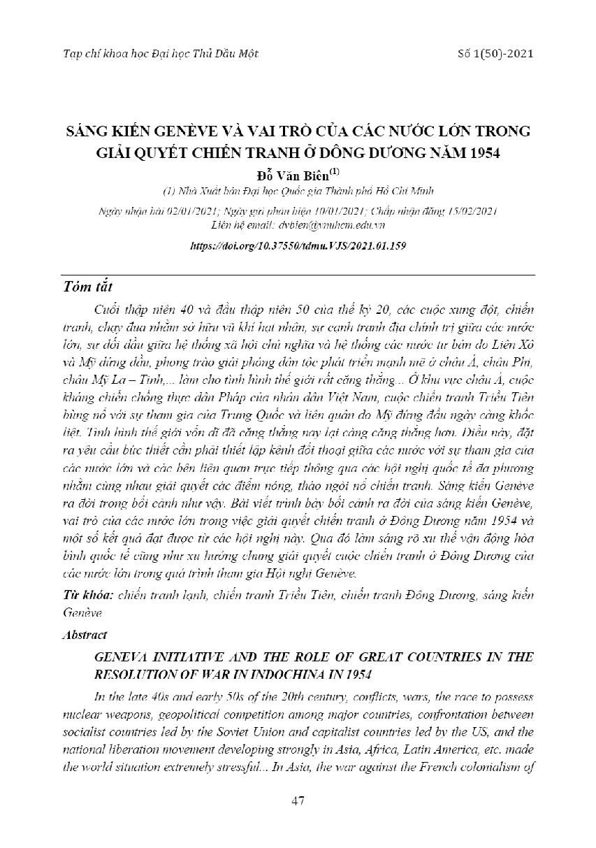 Sáng kiến genève và vai trò của các nước lớn trong giải quyết chiến tranh ở Đông Dương năm 1954 = Geneva initiative and the role of great countries in the resolution of war in indochina in 1954