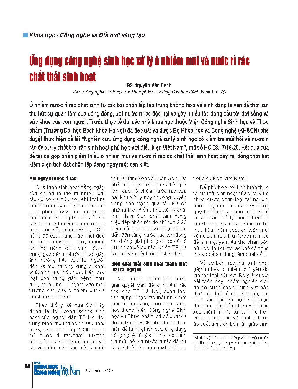 Ứng dụng công nghệ sinh học xử lý ô nhiễm mùi và nước rỉ rác chất thải sinh hoạt = Application of biotechnology to treat odor pollution and domestic waste leachate