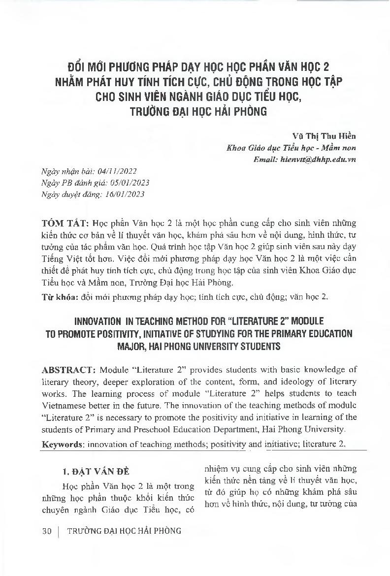 Đổi mới phương pháp dạy học học phần "Văn học 2" nhằm phát huy tính tích cực, chủ động trong học tập cho sinh viên ngành giáo dục tiểu học, Trường Đại học Hải Phòng = Innovation In Teaching Method For "Literature 2" Module To Promote Positivity, Initiativ