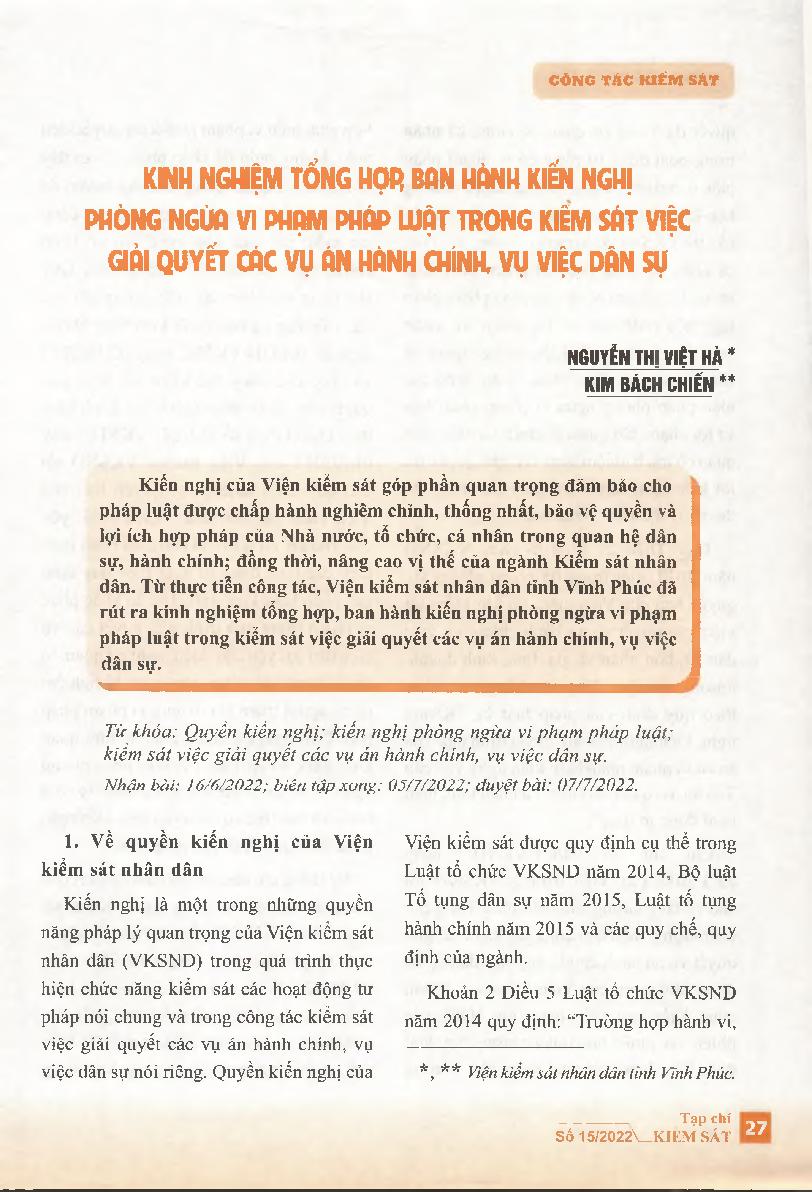 Kinh nghiệm tổng hợp, ban hành kiến nghị phòng ngừa vi phạm pháp luật trong kiểm sát việc giải quyết các vụ án hành chính, vụ việc dân sự