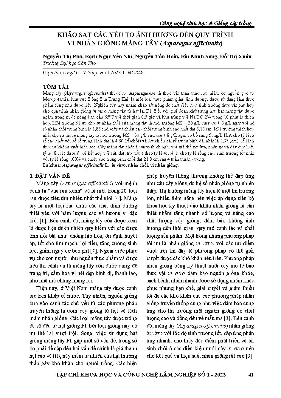 Khảo sát các yếu tố ảnh hưởng đến quy trình vi nhân giống măng tây (asparagus officinalis) = Effect of some factors on micropropagation of asparagus officinalis