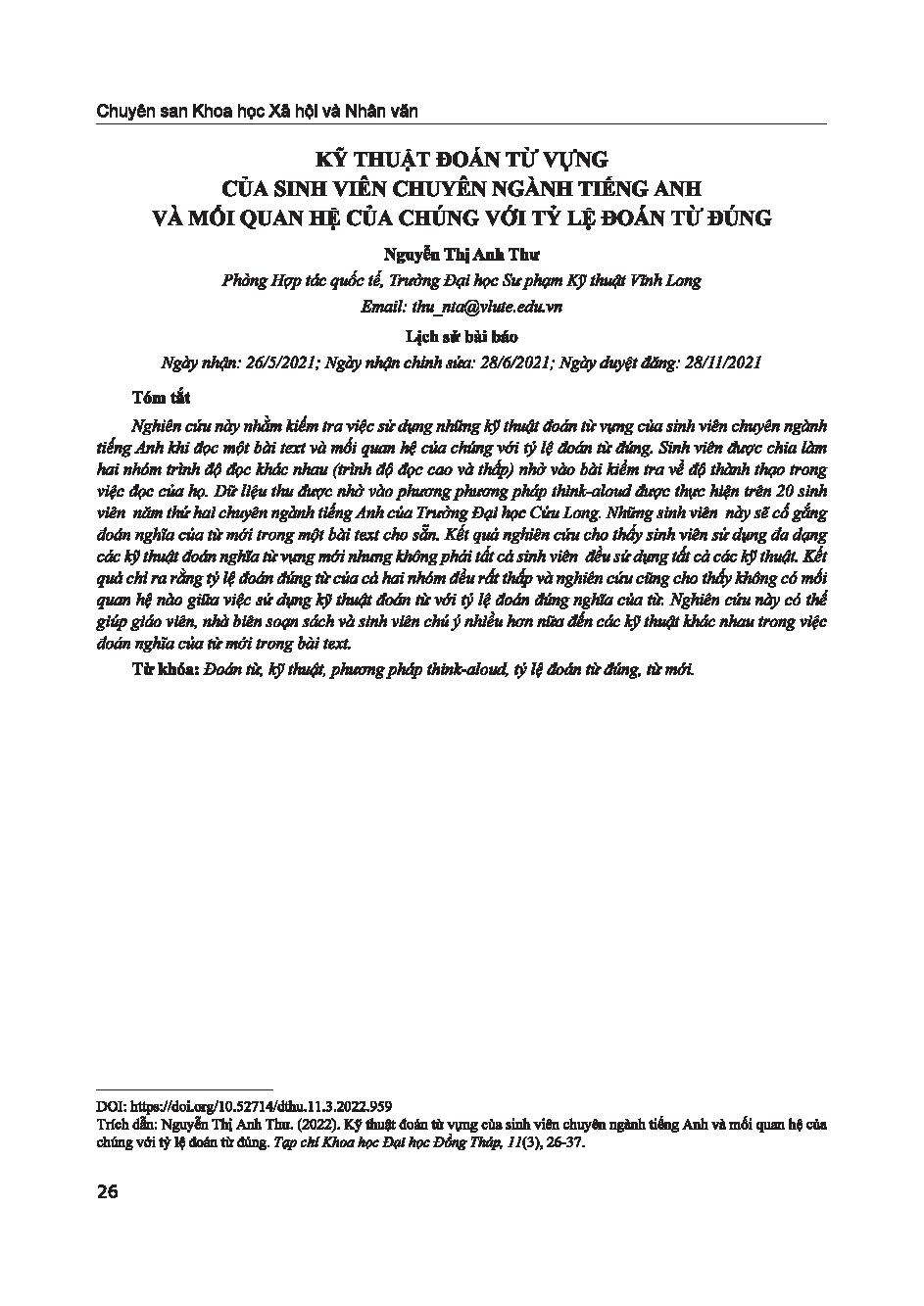 Kỹ thuật đoán từ vựng của sinh viên chuyên ngành tiếng Anh và mối quan hệ của chúng với tỷ lệ đoán từ đúng = EFL students’ use of lexical inferencing strategies and its relationship with inferential success