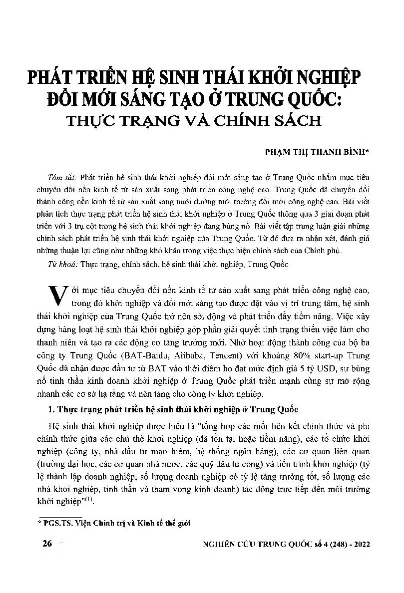 Phát triển hệ sinh thái khởi nghiệp đổi mới sáng tạo ở Trung Quốc: Thực trạng và chính sách = Developing an innovative startup ecosystem in China: Current Situation and Policy