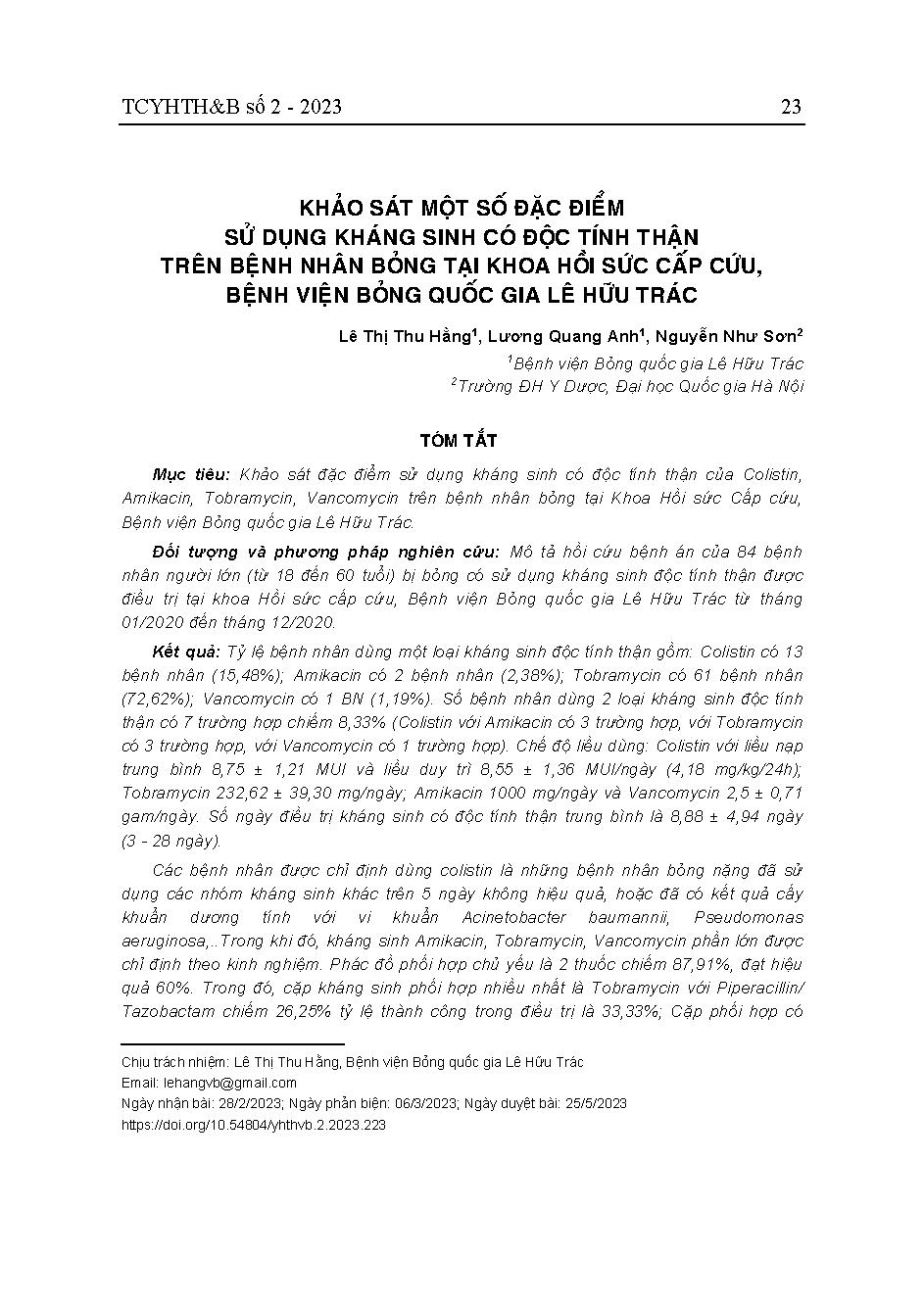 Khảo sát một số đặc điểm sử dụng kháng sinh có độc tính thận trên bệnh nhân bỏng tại Khoa Hồi sức Cấp cứu, Bệnh viện Bỏng Quốc gia Lê Hữu Trác