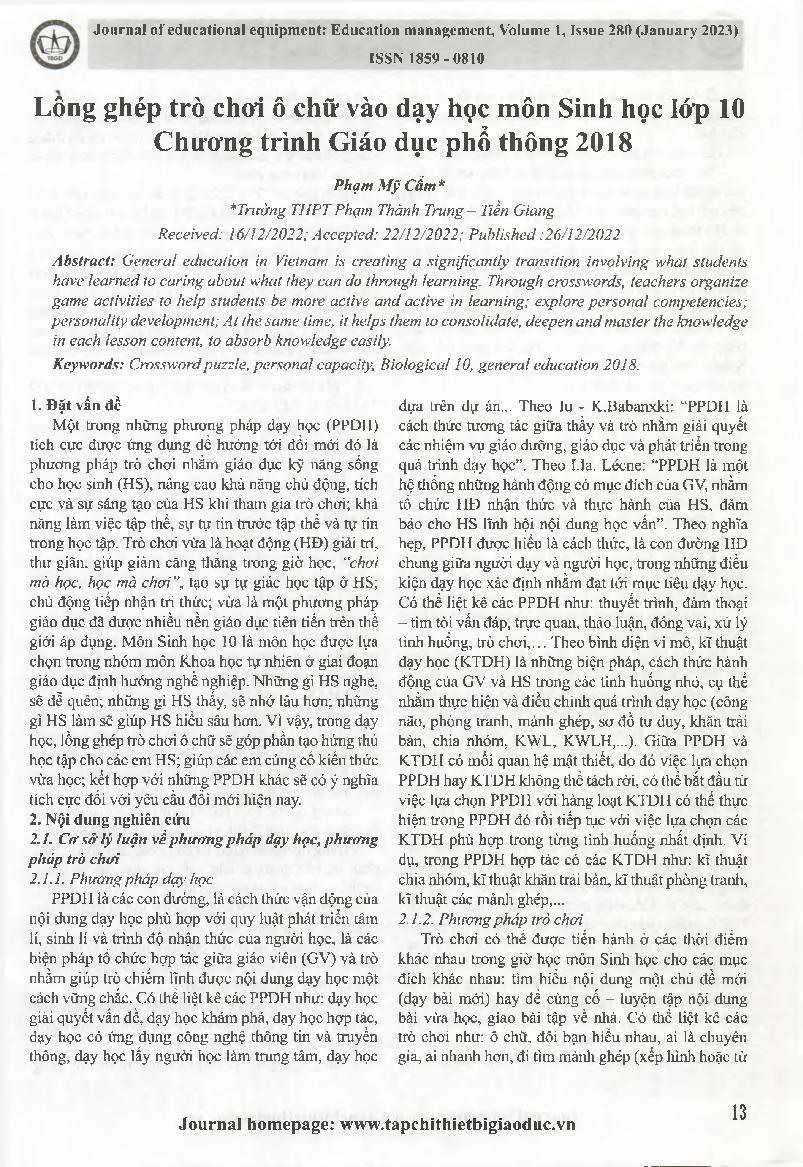 Lồng ghép trò chơi ô chữ vào dạy học môn Sinh học lớp 10 Chương trình Giáo dục phổ thông 2018 = Integrating crossword games into teaching 10th Grade Biology in the 2018 general education program