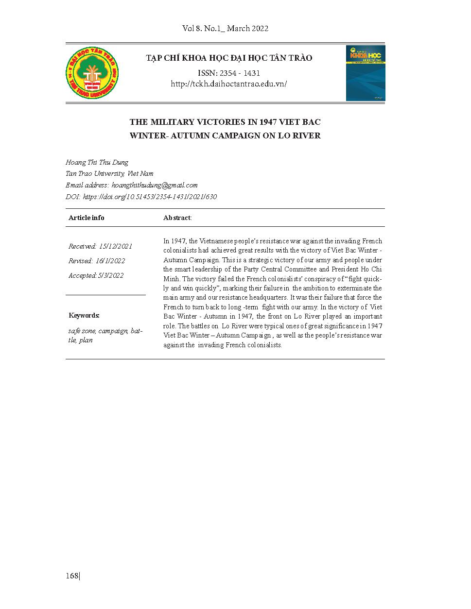 Những thắng lợi quân sự trên sông Lô trong chiến dịch Việt Bắc thu - đông năm 1947 = The military victories in 1947 Viet Bac winter- autumn campaign on Lo river