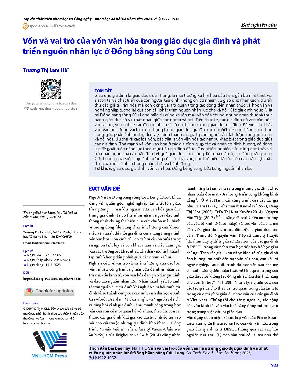 Vốn và vai trò của vốn văn hóa trong giáo dục gia đình và phát triển nguồn nhân lực ở Đồng bằng sông Cửu Long = The capital and the role of the cultural capital in family education and in the human resources development in the Mekong Delta