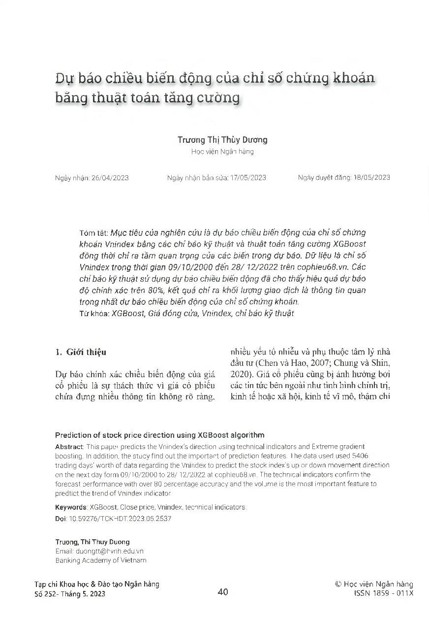 Dự báo chiều biến động của chỉ số chứng khoán bằng thuật toán tăng cường = Prediction of stock price direction using XGBoost algorithm