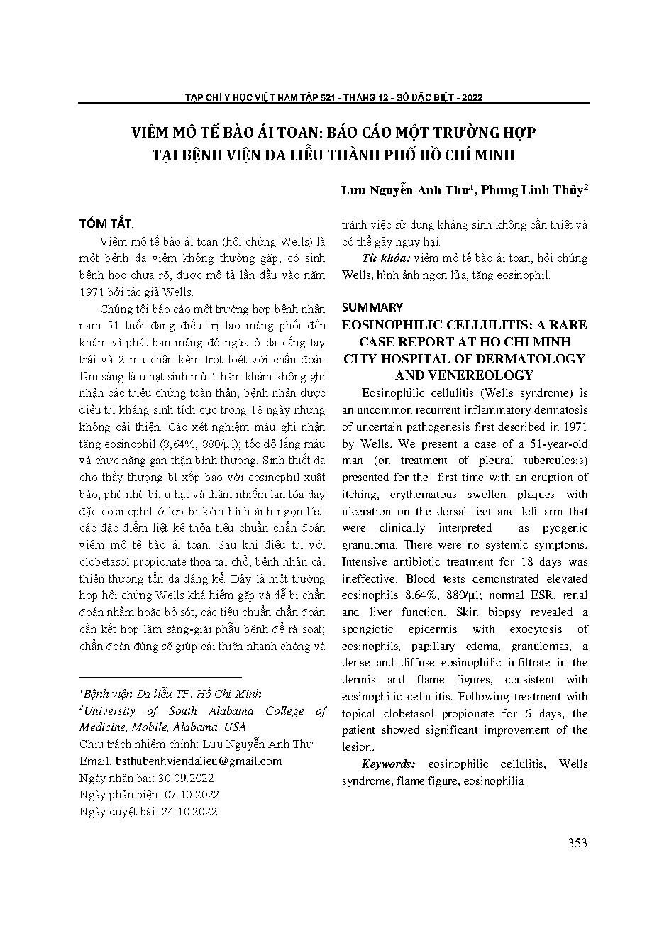 Viêm mô tế bào ái toan: Báo cáo một trường hợp tại Bệnh viện Da liễu thành phố Hồ Chí Minh = Eosinophilic cellulitis: A rare case report at Ho Chi Minh city hospital of dermatology and venereology