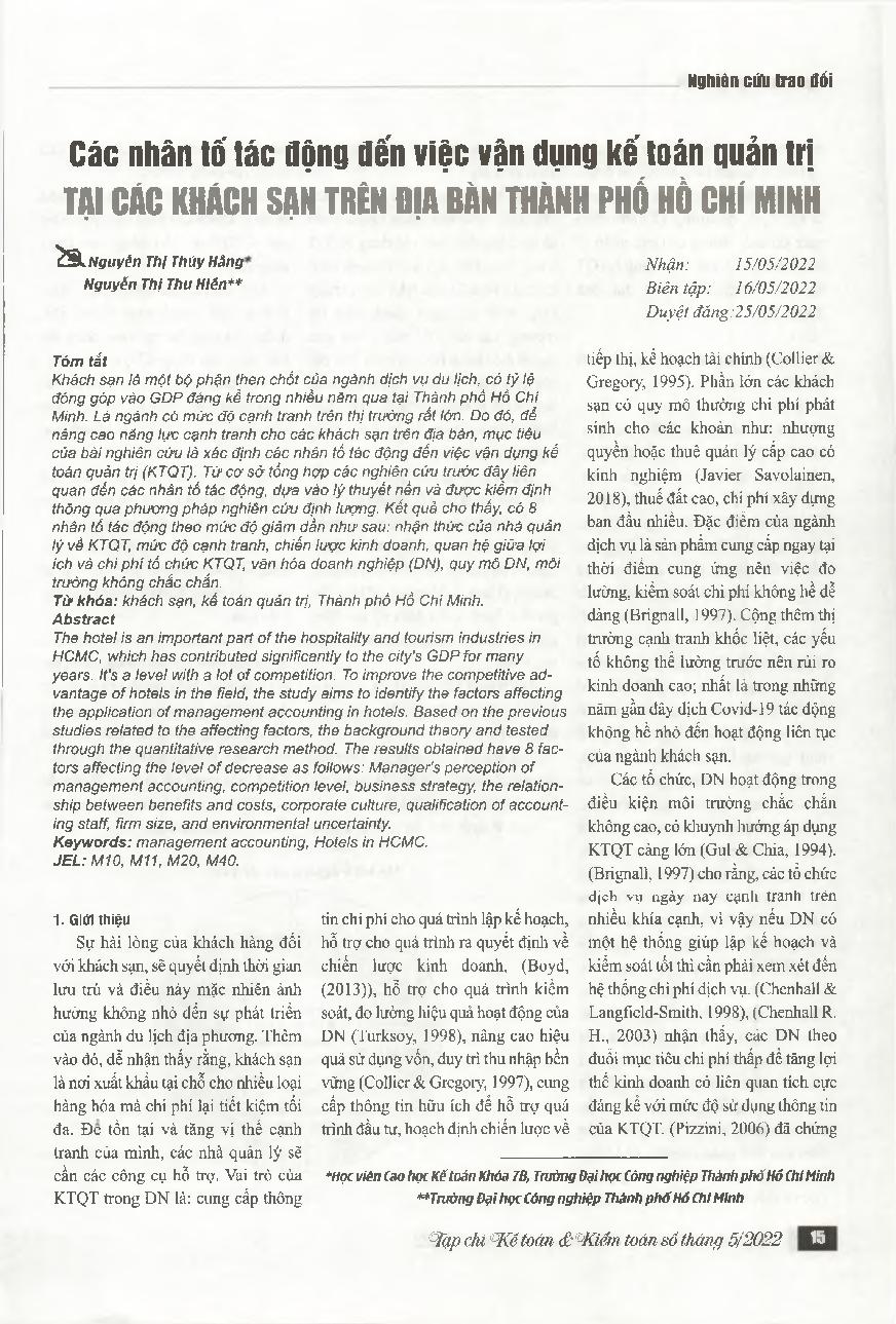 Các nhân tố tác động đến việc vận dụng kế toán quản trị tại các khách sạn trên địa bàn thành phố Hồ Chí Minh = Factors affecting the application of management accounting in hotels in Ho Chi Minh city