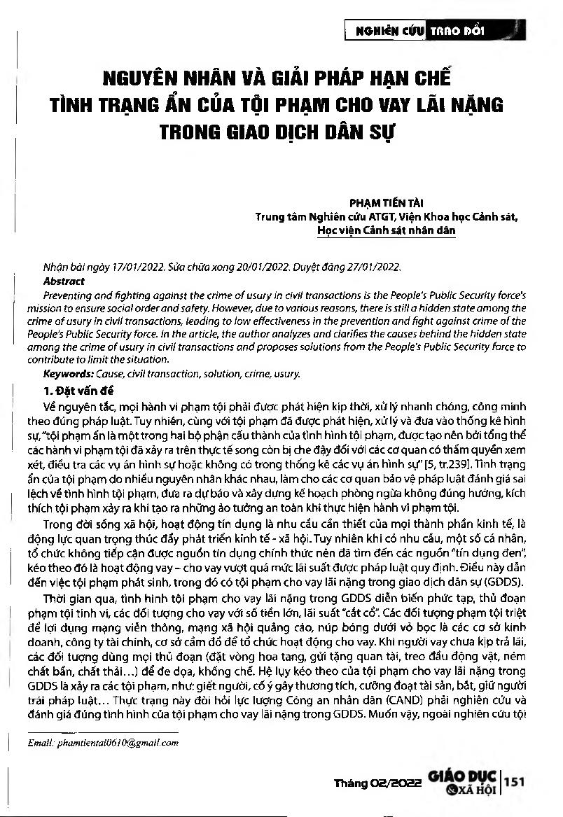 Nguyên nhân và giải pháp hạn chế tình trạng ẩn của tội phạm cho vay lãi nặng trong giao dịch dân sự = Causes and solutions to reduce the hidden state of usury in civil transactions