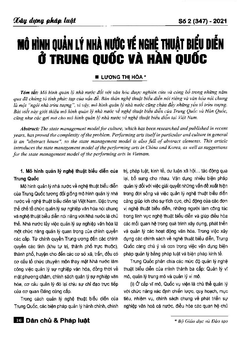 Mô hình quản lý nhà nước về nghệ thuật biểu diễn ở Trung Quốc và Hàn Quốc