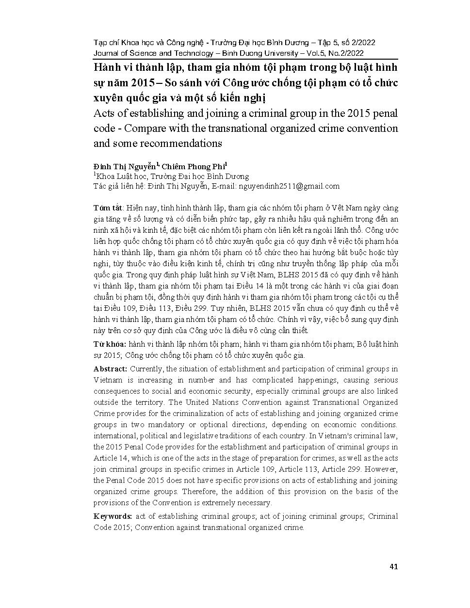 Hành vi thành lập, tham gia nhóm tội phạm trong bộ luật hình sự năm 2015 – So sánh với Công ước chống tội phạm có tổ chức xuyên quốc gia và một số kiến nghị = Acts of establishing and joining a criminal group in the 2015 penal code - Compare with the tran