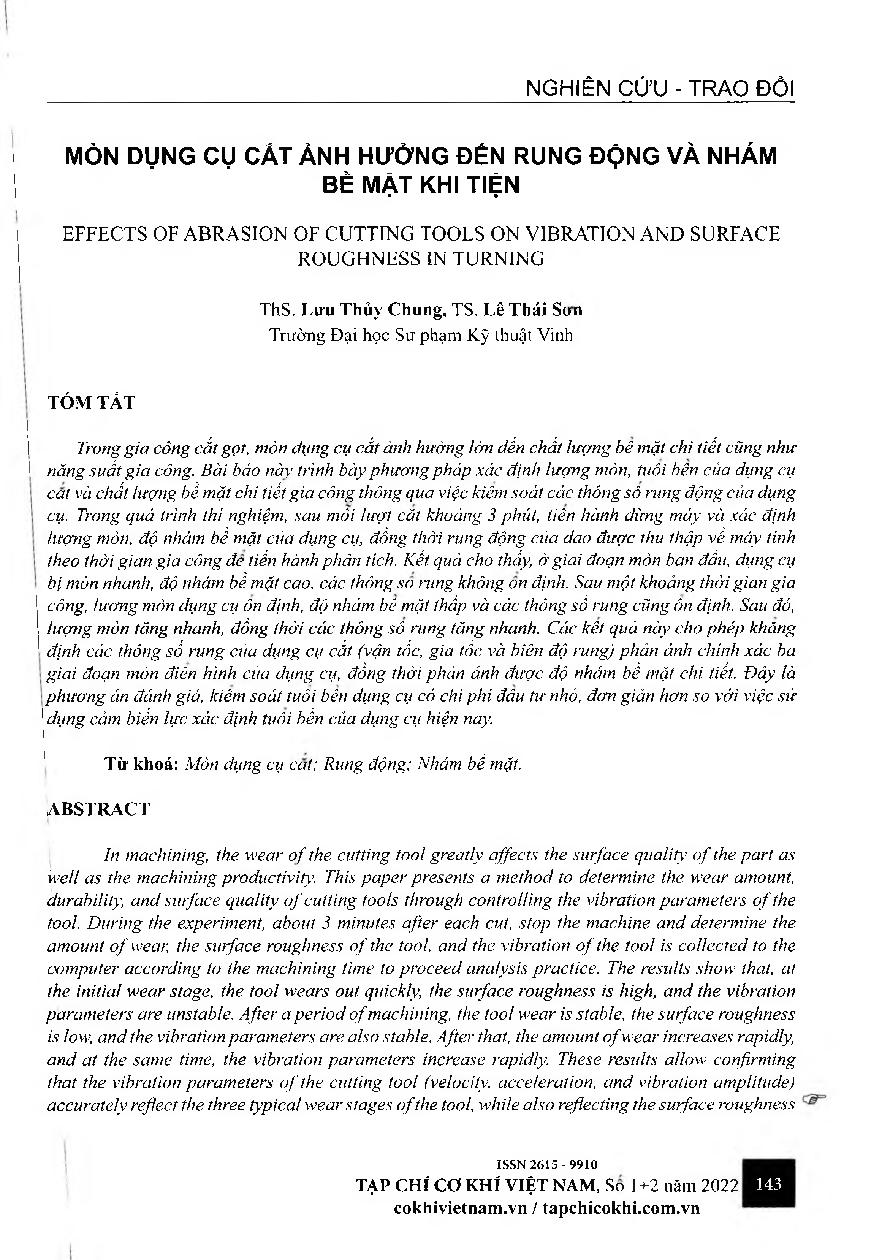 Mòn dụng cụ căt ánh hướng đen rung động và nhám bề mặt khi tiện = Effects of abrasion of cutting tools on vibration and surface roughness in turning