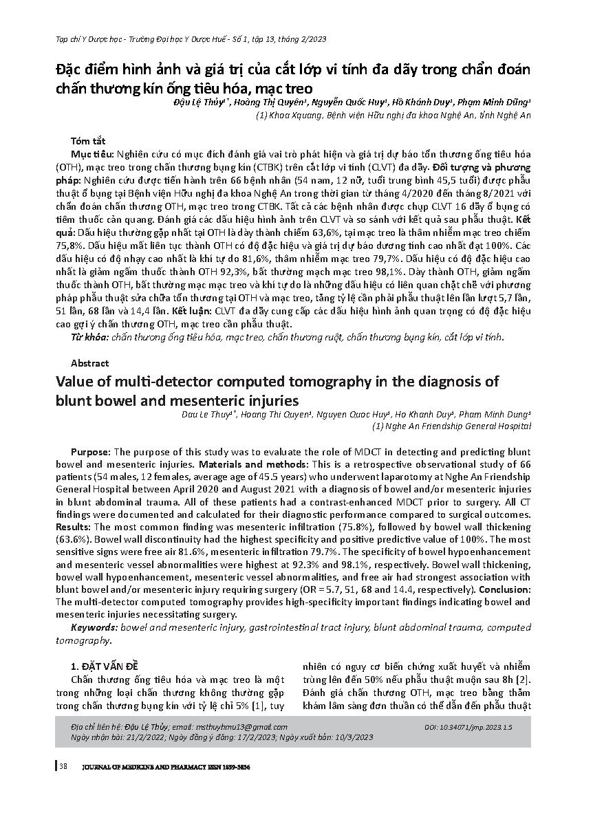 Đặc điểm hình ảnh và giá trị của cắt lớp vi tính đa dãy trong chẩn đoán chấn thương kín ống tiêu hóa, mạc treo = Value of multi-detector computed tomography in the diagnosis of blunt bowel and mesenteric injuries