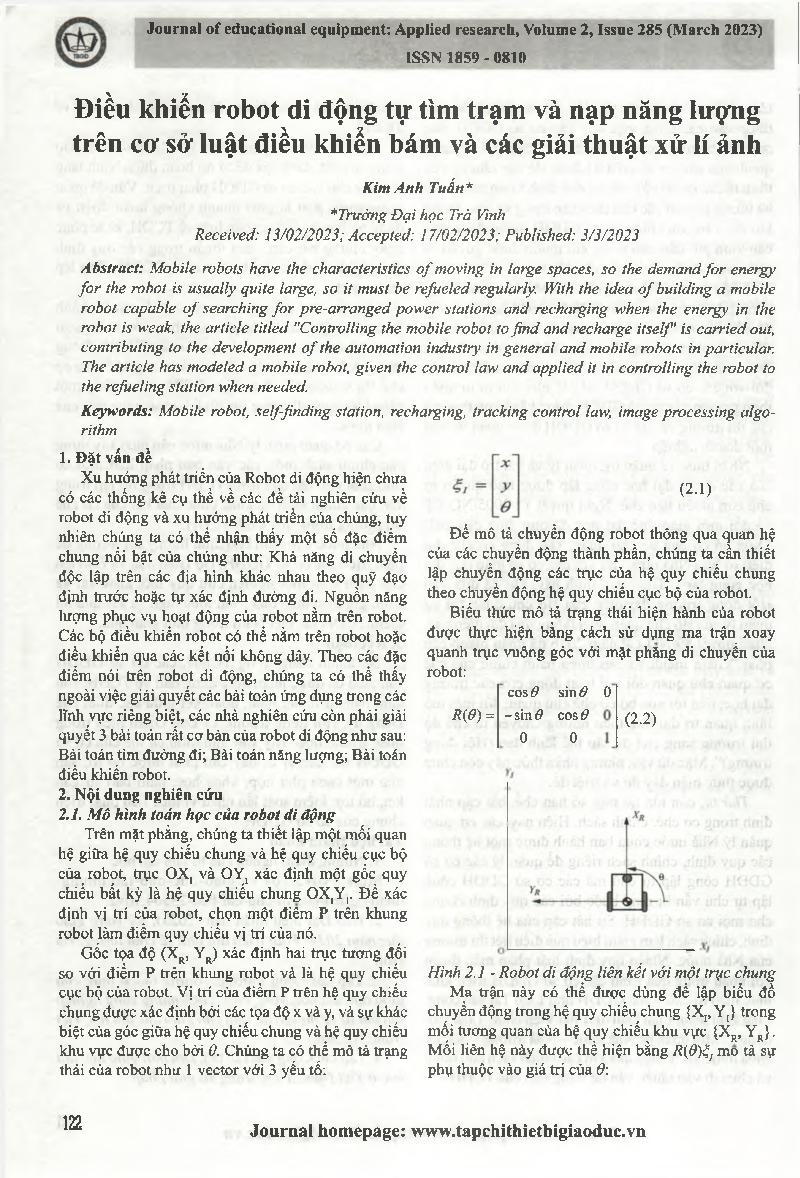 Điều khiển robot di động tự tìm trạm và nạp năng lượng trên cơ sở luật điều khiển bám và các giải thuật xử lí ảnh = Controlling the mobile robot to find stations and recharge on the basis of tracking control law and image processing algorithms